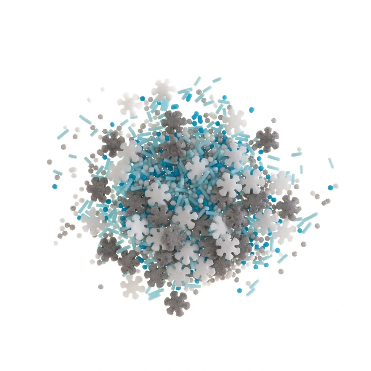 Een sprinklemix met blauwe, witte en grijze sneeuwsterren.